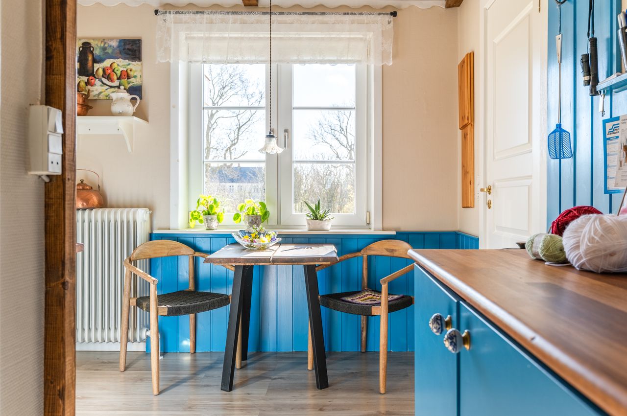 Indenfor bliver du mødt af et hjem, hvor hver eneste detalje er udvalgt med omtanke. Køkkenet er et farverigt hjerterum med blå snedkerløsninger, hyggelige sprossevinduer og kig til både morgenlys og grønne uderum. Herfra er der direkte adgang til spisestue og opholdsrum, hvor varme nuancer, trælofter og klassiske møbler inviterer til fællesskab, samtaler og langsomme måltider. Hele stueplanet har en rolig rytme, hvor rummene er godt proportioneret, og der er en klar fornemmelse af, at her er det let at føle sig hjemme.
